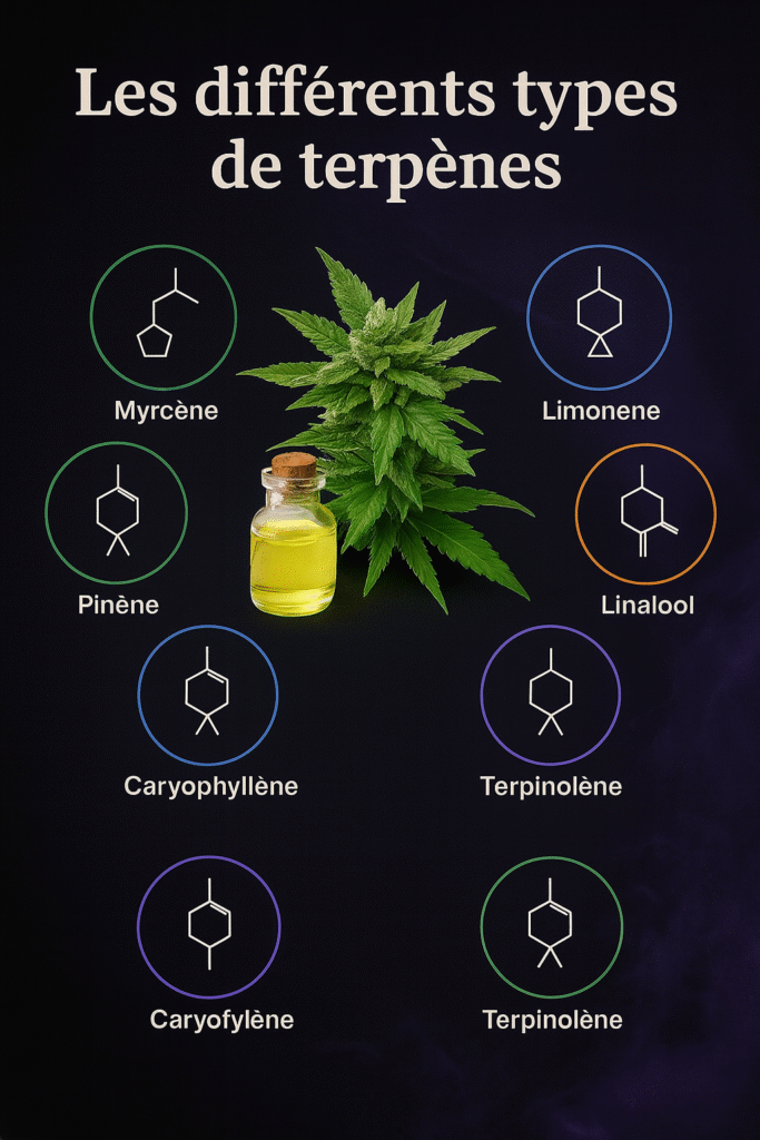 • les principaux types de terpènes qu’on retrouve dans le cannabis ;