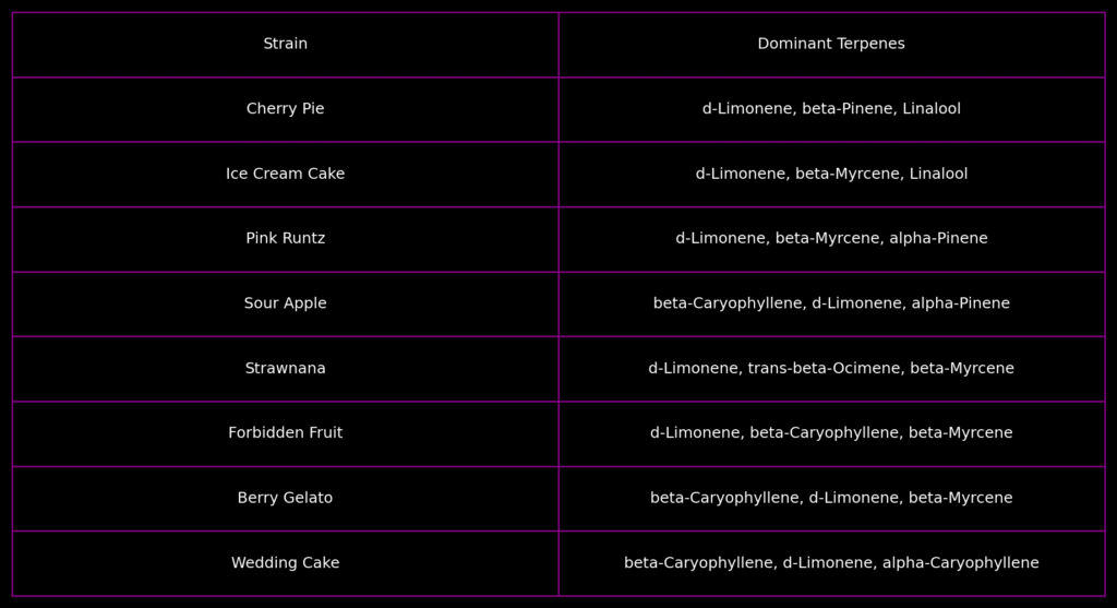 → Choisis des profils riches en caryophyllène, myrcène, pinène (souvent les “Cake” ou certaines “OG”).